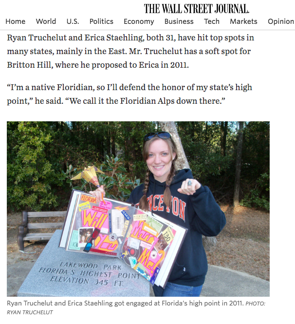 A reporter from the Wall Street Journal reached out to me in February about highpointing, more specifically the quest for bagging some of America’s lowest peaks. Ryan (husband) ended up giving the interview, since I was barely a few days postpartum and originally thought it was some sort of phishing scheme in my delirium. But it wasn’t, it was actually a bizarre front page story, and I even got my picture on their website out of the deal!